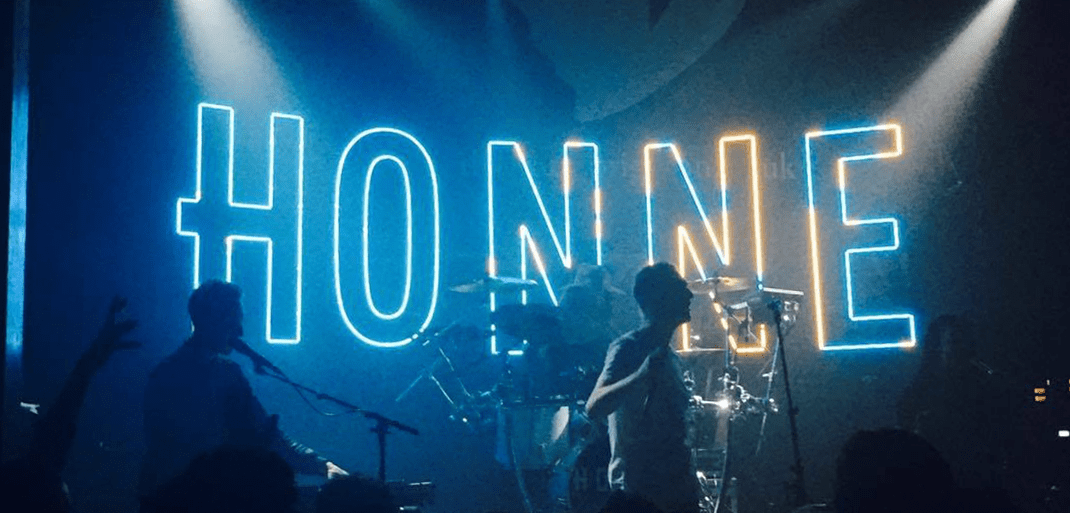 But HONNE’s set, as demonstrated throughout the evening, need not be recalled as merely a luscious jivefest – as discussed back in July when the duo released Warm On A Cold Night, their “flowing and cohesive set of soulful electronica gleaming with romance,” the formula for university friends Andy Clutterbuck and James Hatcher is completely unambiguous: channeling their effortless charm and romantic tendencies through a blend of hopeful synth melodies and homages to gospel, jazz, and occasional balladry. Their live show, performed in front of brightly-edged outlines (that did briefly wobble steadily) of their Japanese name, adds a drummer and bassist – for live complements to Hatcher on keys and Clutterbuck on vocals and occasional guitar – and Naomi Scarlett, a backing vocalist who steps to the fore for two tracks late in the set. (The preceding show at London’s Roundhouse also featured a gospel choir and JONES, on whose debut album New Skin they produced ‘Melt’ and ‘Walk My Way’ after her feature on ‘No Place Like Home’ for their January EP Gone Are The Days: Shimokita Import.) Together, they transform the songs from their often composed recorded demeanour into something yet more spacious and enthralling.